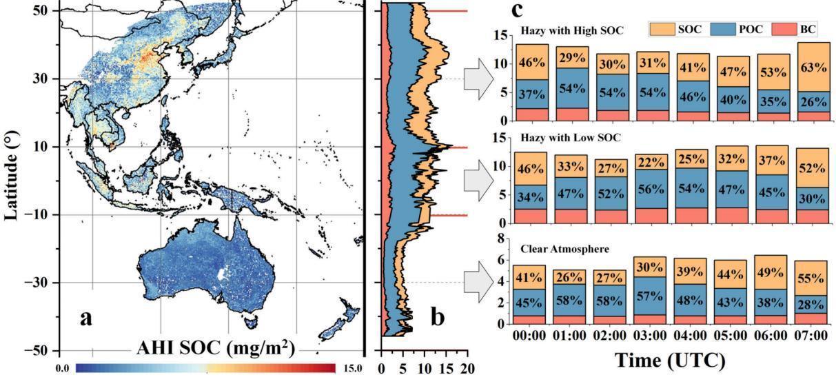 图2 (a)为 2018年二次有机气溶胶(SOC)反演结果;(b)为 2018年碳质气溶胶浓度(BC、POC和SOC)的纬向变化;(c)为高中低SOC纬度区BC、POC和SOC含量占总碳浓度的比例的小时变化