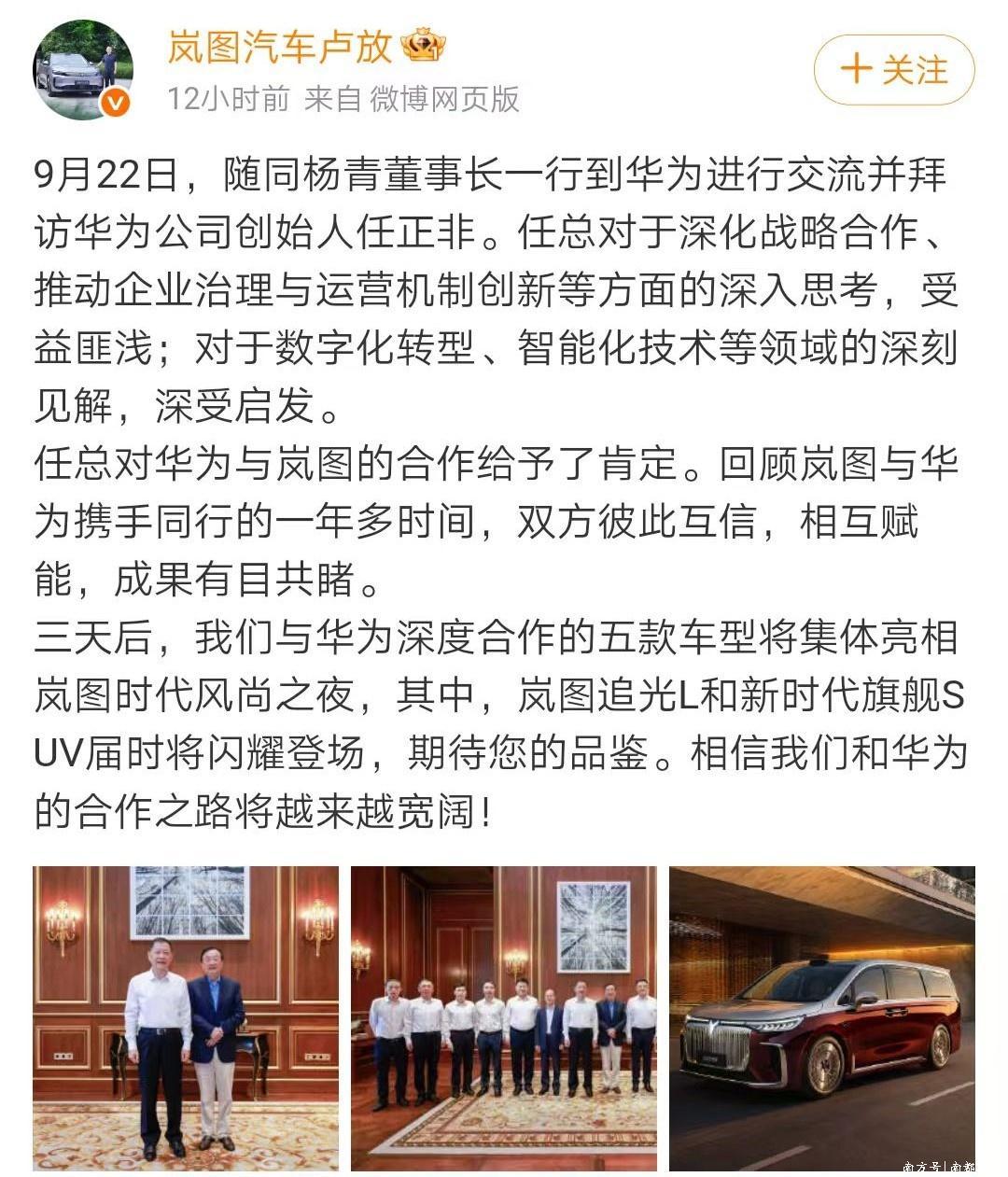 岚图汽车CEO卢放在9月23日在其社交平台上发文,称随同杨青董事长一行到华为进行交流并拜访华为公司创始人任正非。他不忘“预告”该品牌的新品发布:三天后,该品牌与华为深度合作的五款车型将集体亮相岚图时代风尚之夜,其中岚图追光L和新时代旗舰SUV届时将登场。